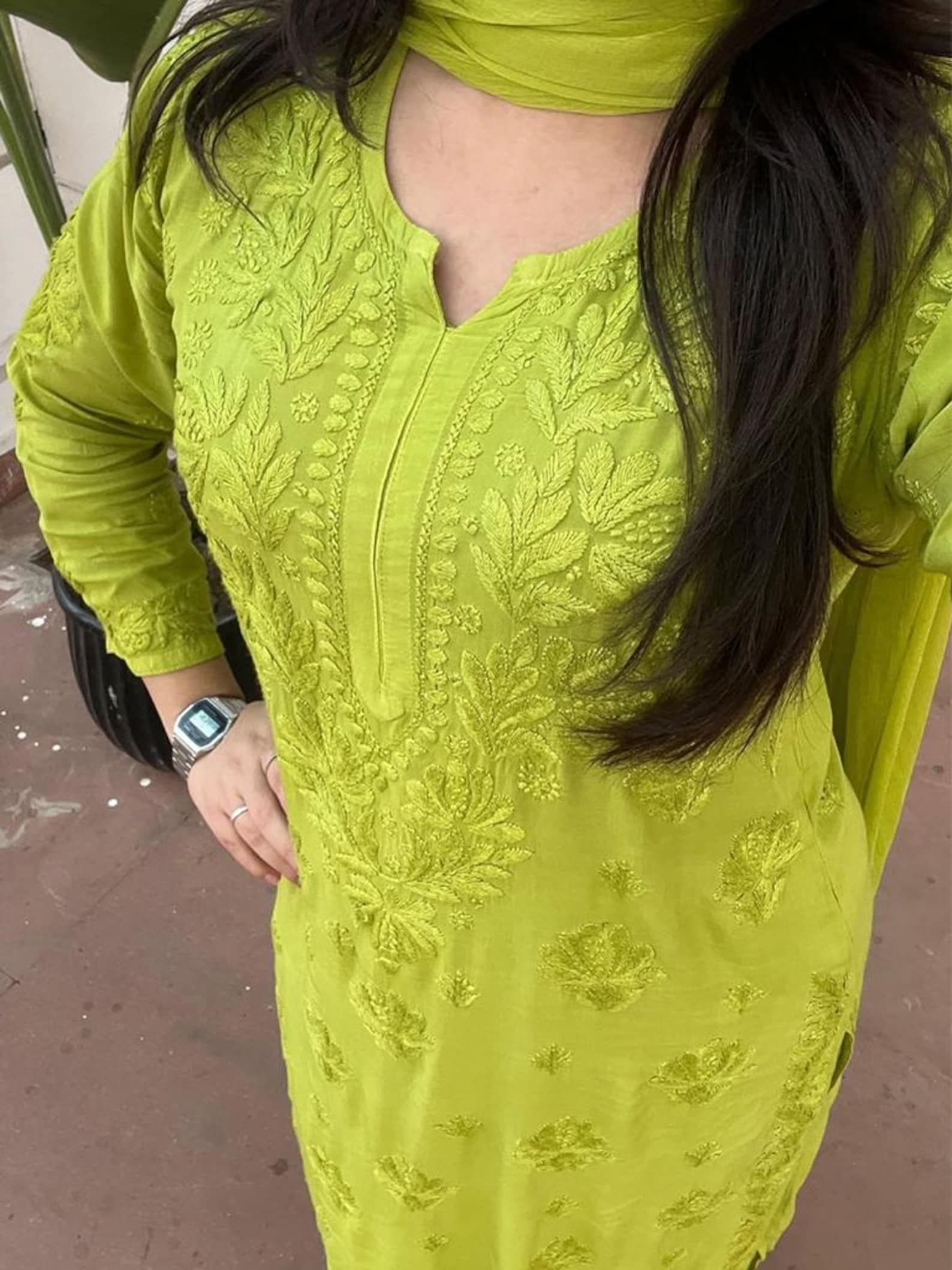 - कढ़ाई: बारीक और विस्तृत सिलाई के साथ प्रामाणिक लखनवी चिकनकारी।