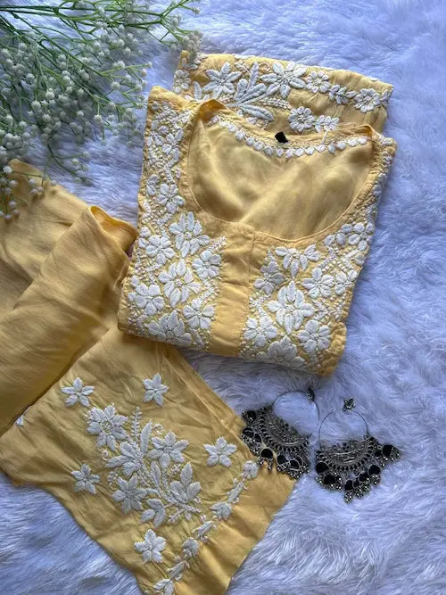 Elevate your wardrobe with the Aiman Yellow Modal Lucknowi Chikankari Co-Ord Set, a perfect blend of traditional embroidery and modern style. This handcrafted kurta and pant ensemble is made from premium modal fabric, offering lightweight comfort and a stylish silhouette. With delicate white chikankari detailing, this set is perfect for festive occasions, casual gatherings, or daytime celebrations.