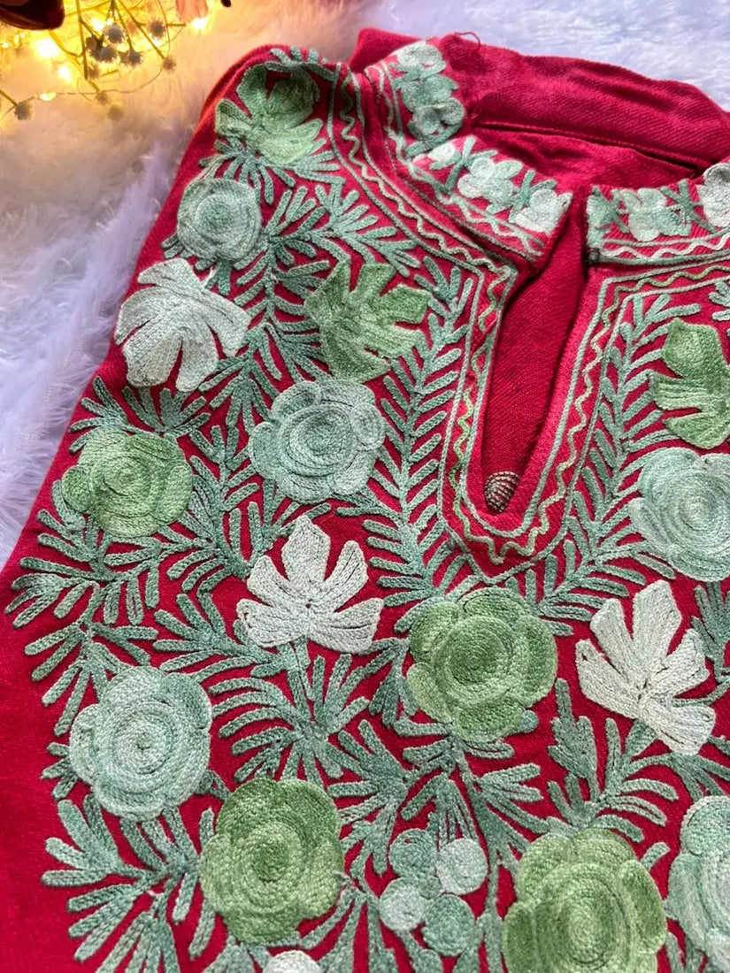Our Collar Neck Kashmiri Aari Work Woollen Lawn Kurta is a masterpiece of heritage artistry and cozy elegance. Hand-embroidered with intricate Aari stitches inspired by the valleys of Kashmir, this kurta blends traditional charm with modern sophistication.