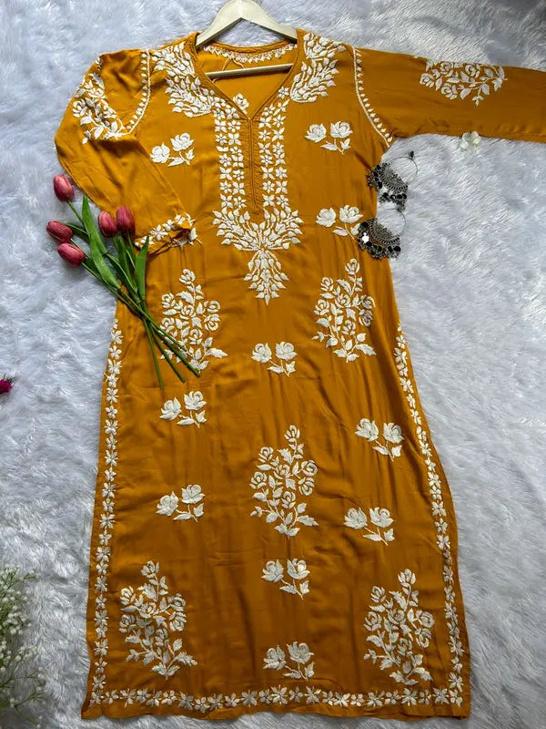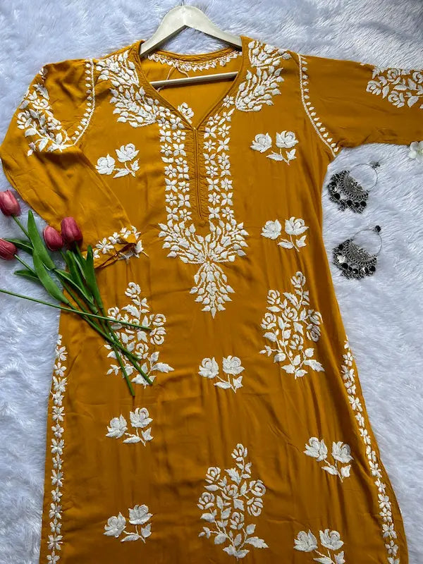 Elevate your wardrobe with the Rose Mustard Modal Lucknowi Chikankari Kurti, combining traditional hand embroidery with modern comfort. Crafted from premium modal cotton, this chic kurti features delicate white chikankari work, making it a versatile choice for both festive occasions and everyday wear.