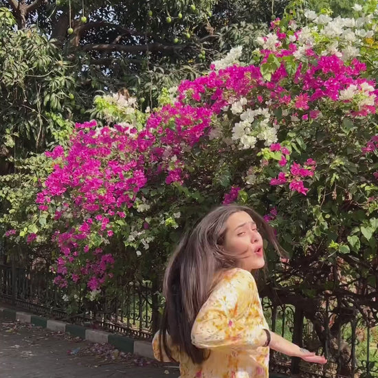 Step into charm with the Shifa Yellow Mul Mul Lucknowi Chikankari Set, a perfect blend of traditional craftsmanship and modern style. Featuring a kurta and palazzo, this lightweight mul mul cotton set is hand-embroidered with delicate white chikankari, offering effortless elegance for festive occasions or casual outings.